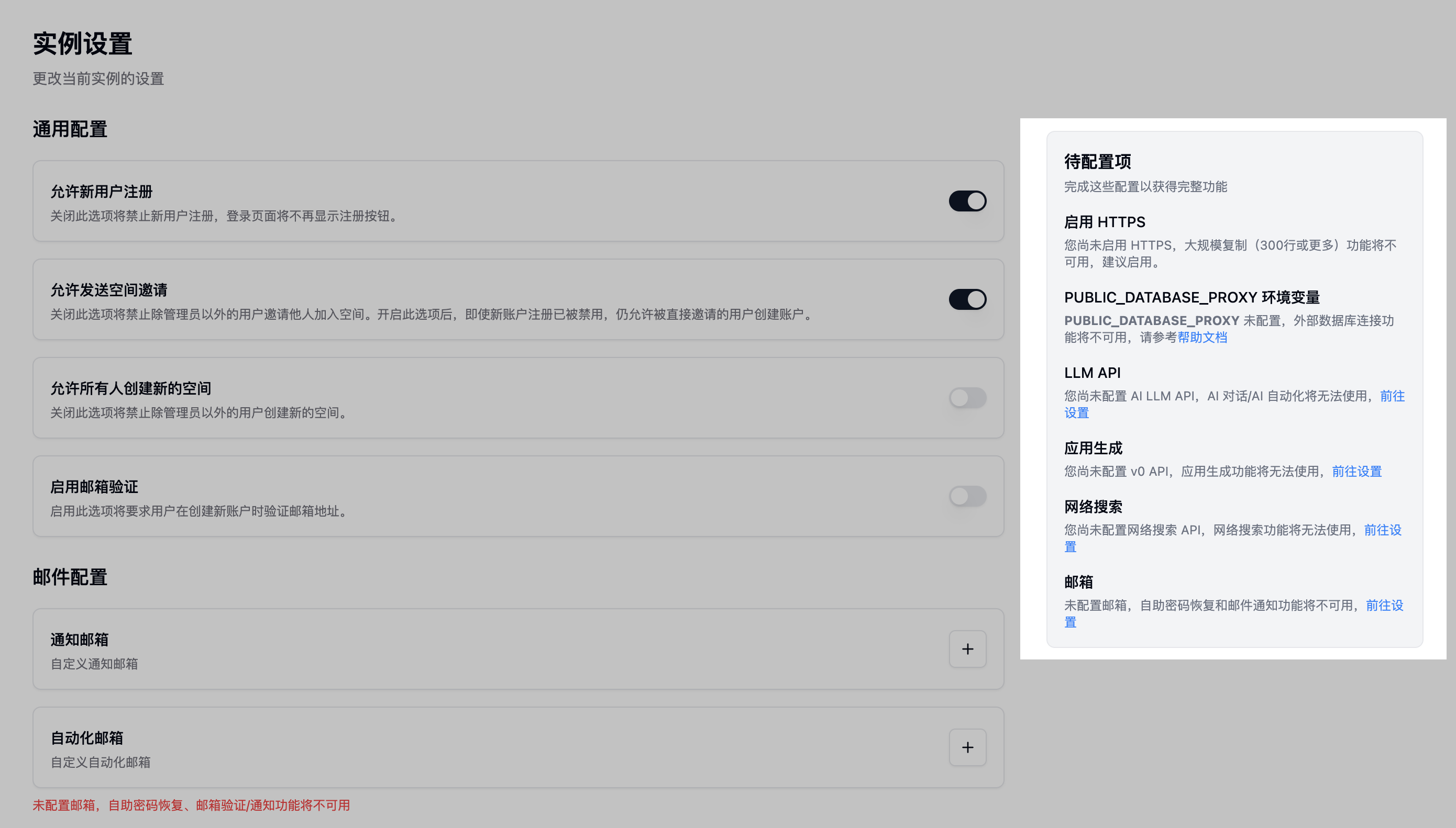 - 允许发送空间邀请: 关闭此选项将禁止除管理员以外的用户邀请他人加入空间。开启此选项后,即使新账户注册已被禁用,仍允许被直接邀请的用户创建账户。