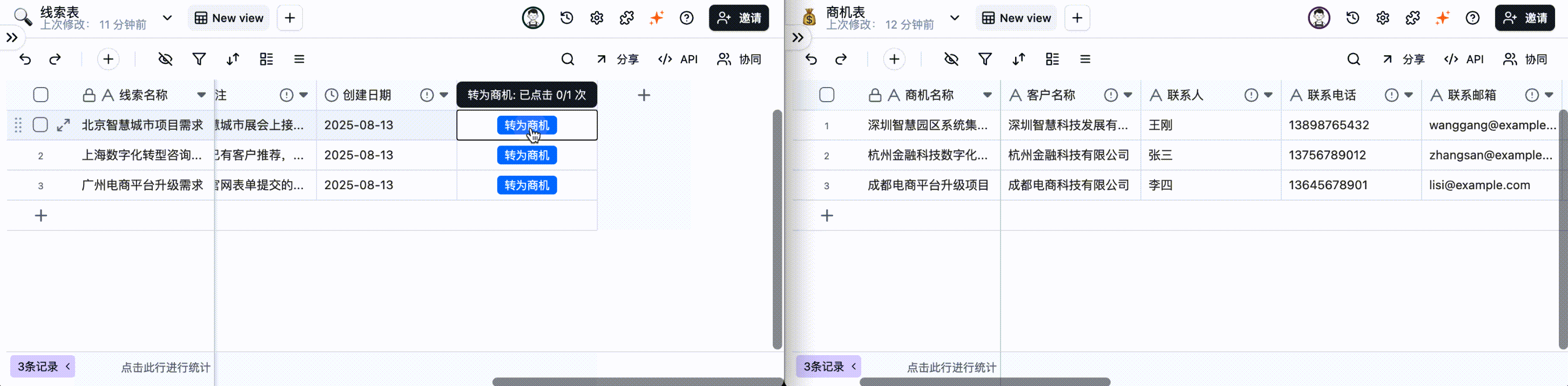 按钮字段的核心价值在于连接与执行。它可以连接表格内部的数据,也能连接外部的系统和服务,并将一系列操作封装成一次点击。场景1:线索一键转商机