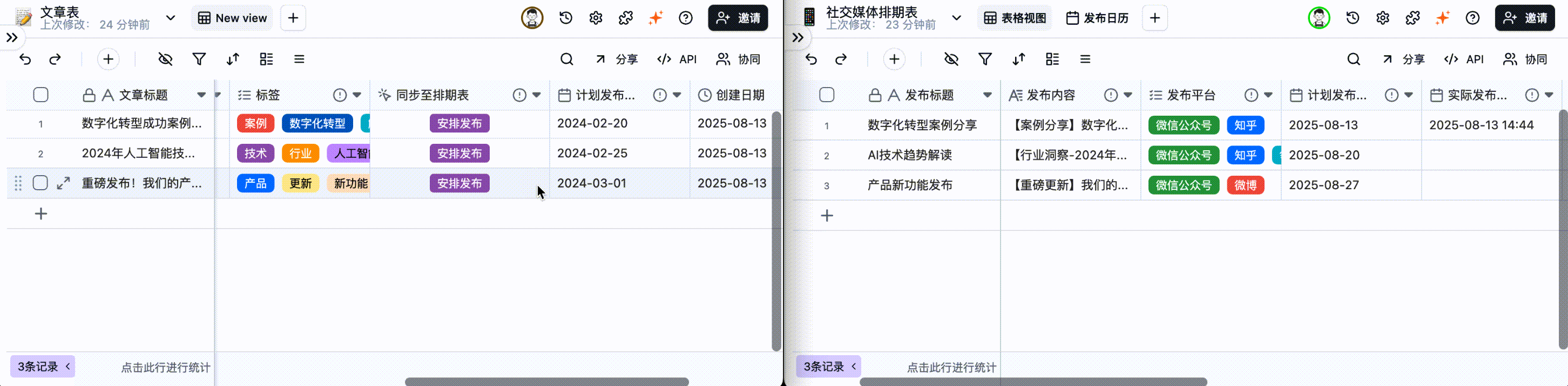 项目任务临近截止日期但仍未完成,项目经理点击「催办」按钮。 系统会立即通过企业微信/钉钉/飞书/邮件发送一条消息:“【任务催办】您负责的「XXX」任务即将到期,请加快进度!” 这将表格与团队的沟通工具无缝集成。