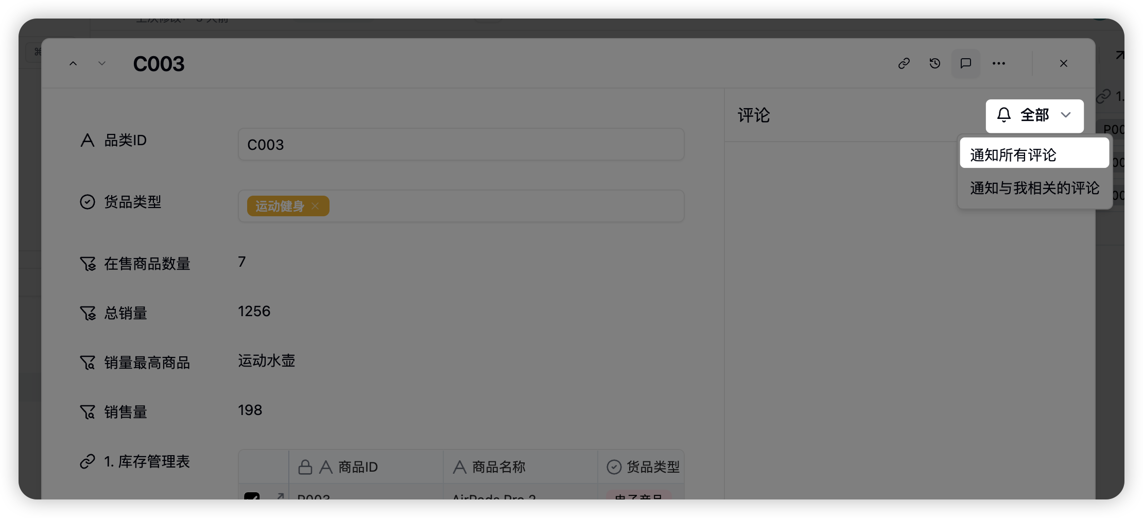 - 入口:点击任意一行记录将其展开为详情卡片,点击右上角的 评论 图标 即可打开侧边评论栏