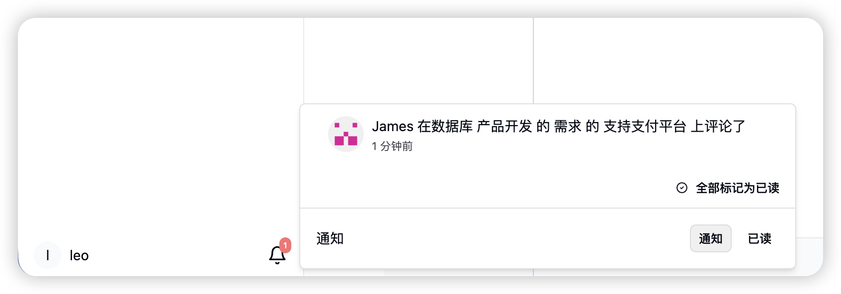 - 任务澄清:在“需求开发”任务下,开发人员直接 @产品经理 询问某个细节逻辑,对话记录永久留存在记录中,方便回溯