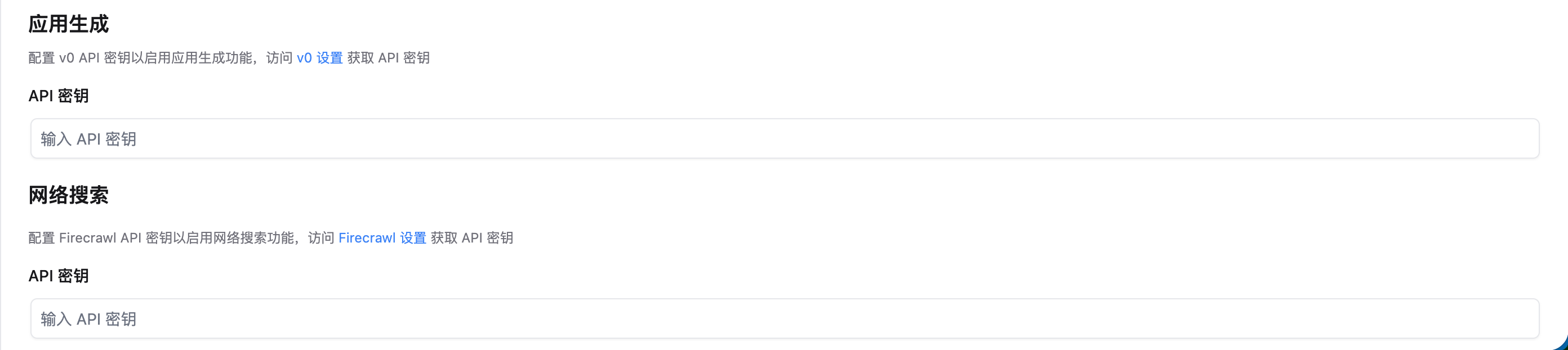 - 配置 v0 API 密钥以启用应用生成功能,访问 v0 设置 获取 API 密钥
