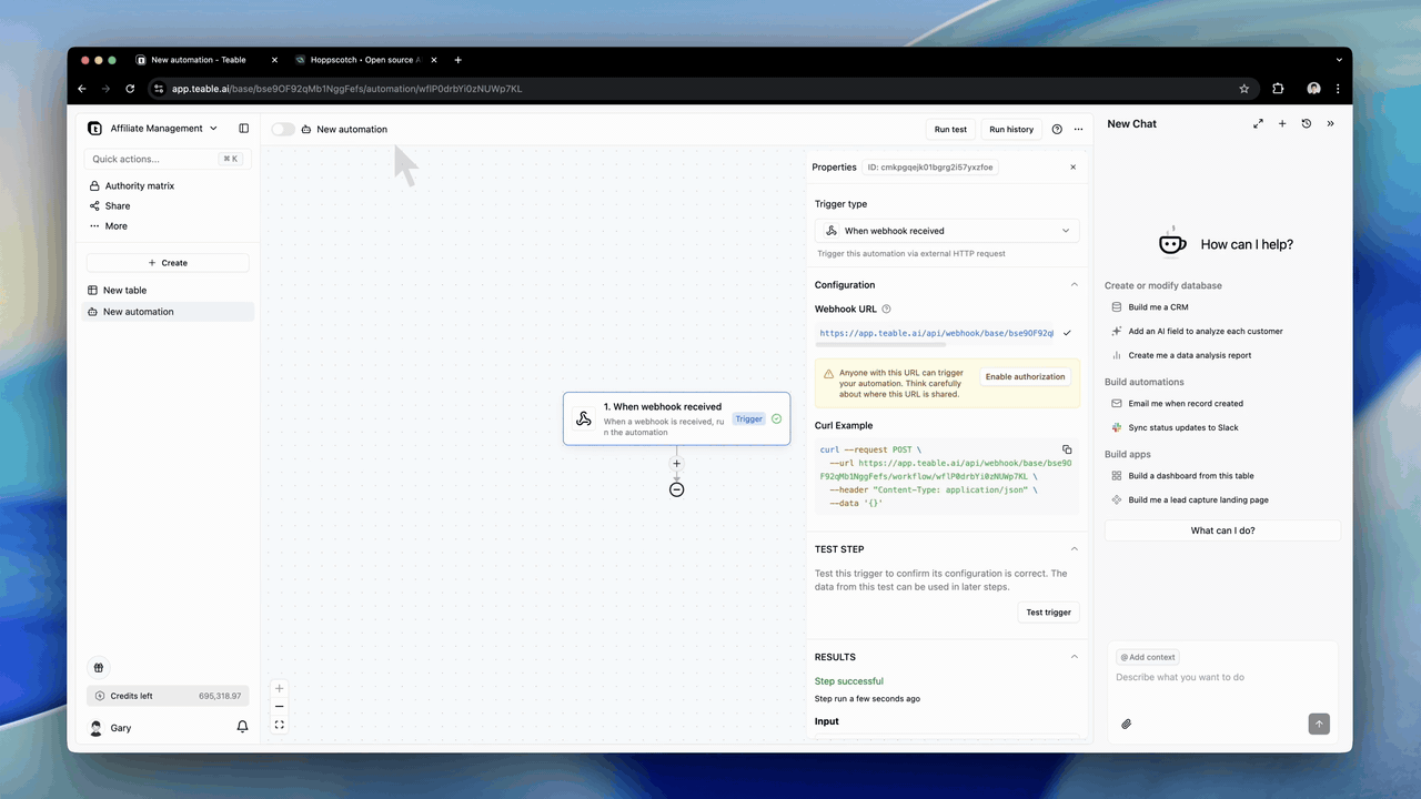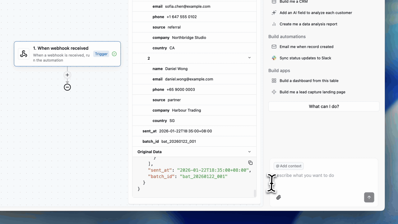 新增“当收到 Webhook 时”——一个新的传入 Webhook 触发器,让您可以连接更多数据到 Teable。亮点 1:秒级设置